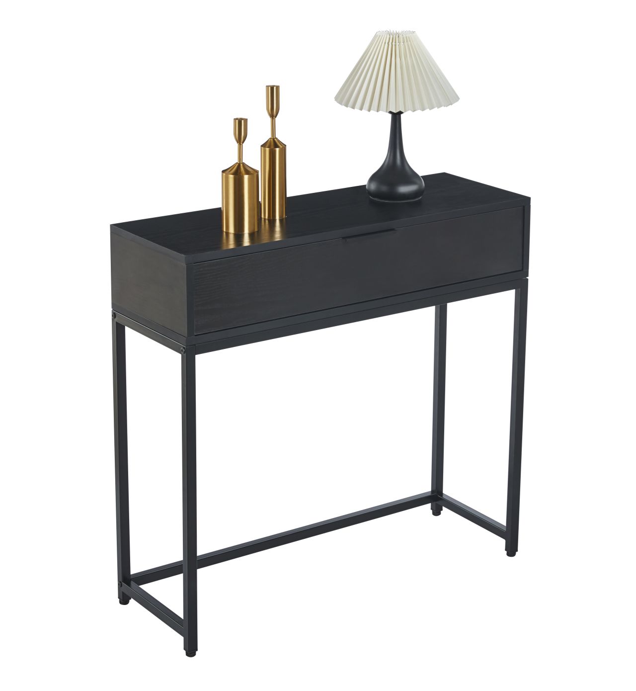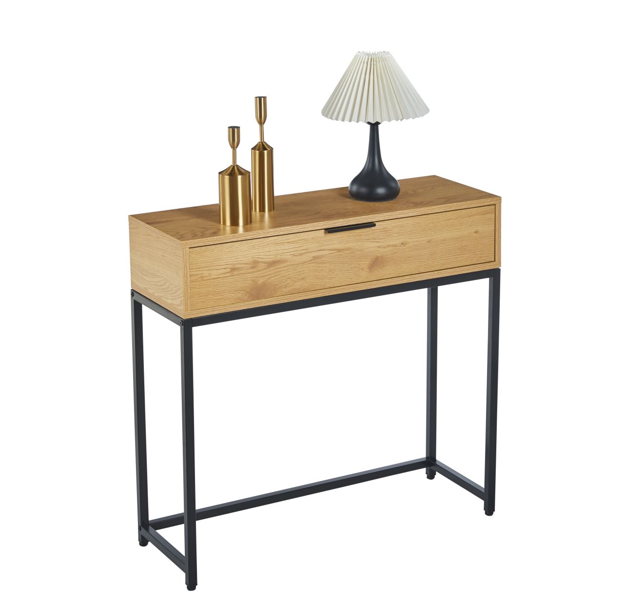 Minimalistyczna konsola w nowoczesnym, industrialnym stylu. Prosta forma połączona z metalowym stelażem sprawia, że mebel doskonale sprawdzi się w przedpokoju, salonie lub sypialni. Praktyczna szuflada pozwala na wygodne przechowywanie drobnych przedmiotów, a smukła konstrukcja nie przytłacza wnętrza.