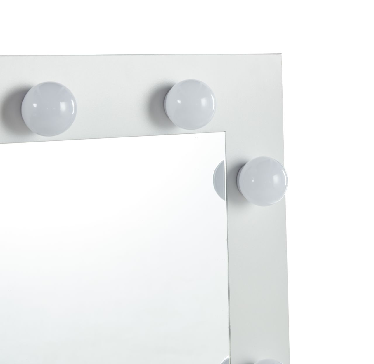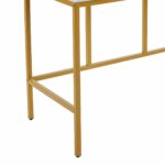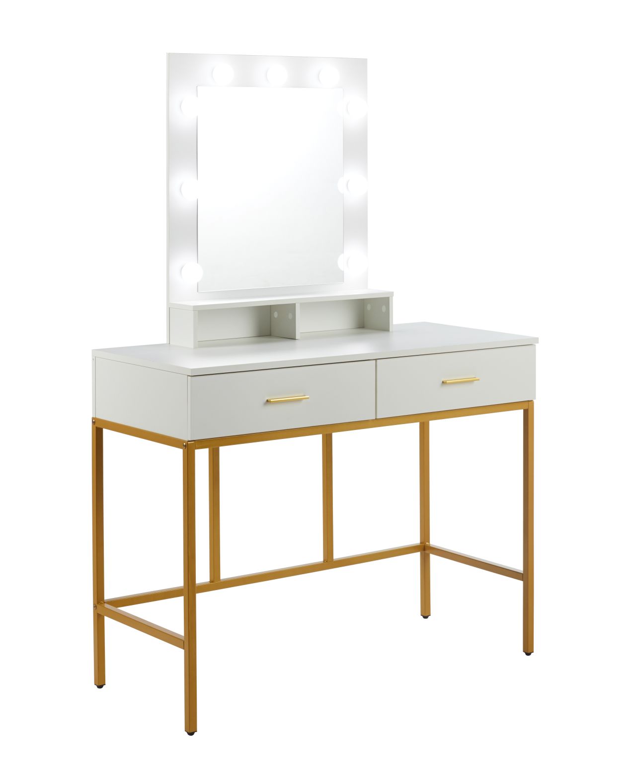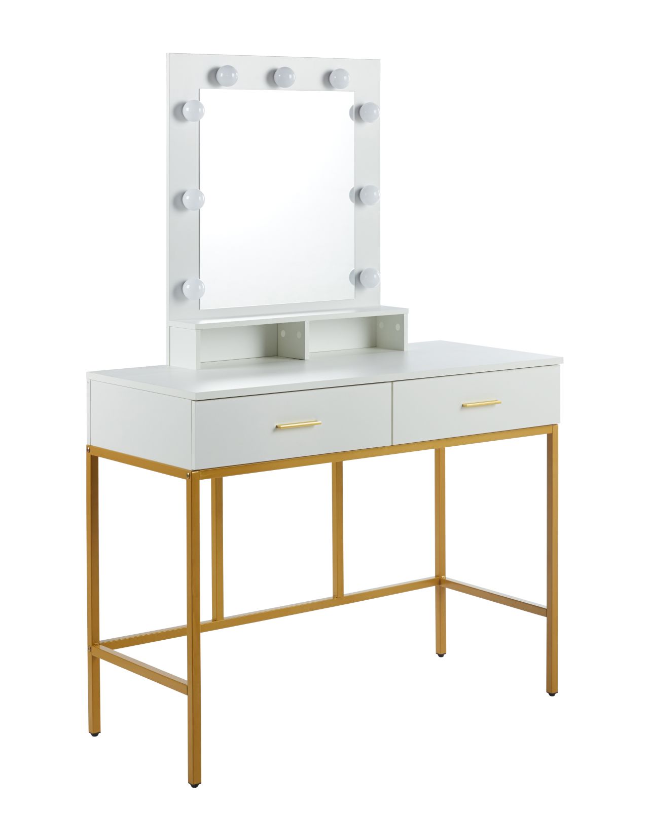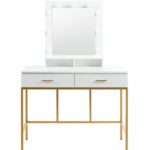 Stylowa toaletka łącząca nowoczesną formę z eleganckimi, złotymi akcentami. Duże lustro z wbudowanym oświetleniem LED zapewnia idealne warunki do wykonywania makijażu i codziennej pielęgnacji. Stabilny metalowy stelaż malowany proszkowo w kolorze złotym nadaje całości luksusowego charakteru, a dwie pojemne szuflady umożliwiają wygodne przechowywanie kosmetyków i akcesoriów.