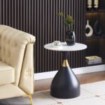 Elegancki okrągły stolik kawowy z ceramicznym blatem w kolorze białego marmuru to wyjątkowy dodatek do nowoczesnych i luksusowych wnętrz. Designerska forma połączona z czarną metalową podstawą malowaną proszkowo oraz subtelną złotą dekoracją tworzy efektowny mebel w stylu glamour, modern i art déco.