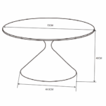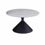 Nowoczesny okrągły stolik kawowy z ceramicznym blatem w kolorze białego marmuru to elegancki element wyposażenia salonu, który doskonale wpisuje się w aranżacje nowoczesne, minimalistyczne oraz loftowe. Jasny blat z delikatnym marmurowym użyleniem pięknie kontrastuje z czarną, metalową podstawą malowaną proszkowo, nadając całości wyrazisty i designerski charakter.