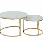 Złoty stelaż z chromowanego metalu zapewnia stabilność, trwałość i nowoczesny wygląd, a okrągła forma stolików dodaje wnętrzu lekkości i harmonii.